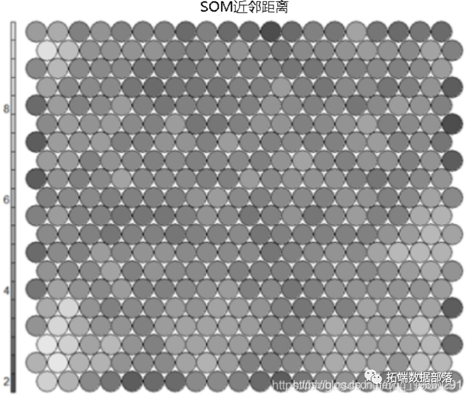 通常称为“ U矩阵”,此可视化表示每个节点与其邻居之间的距离。通常使用灰度查看,邻居距离低的区域表示相似的节点组。距离较大的区域表示节点相异得多。U矩阵可用于识别SOM映射内的类别。# U-matrix 可视化