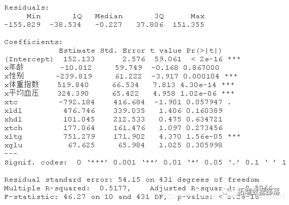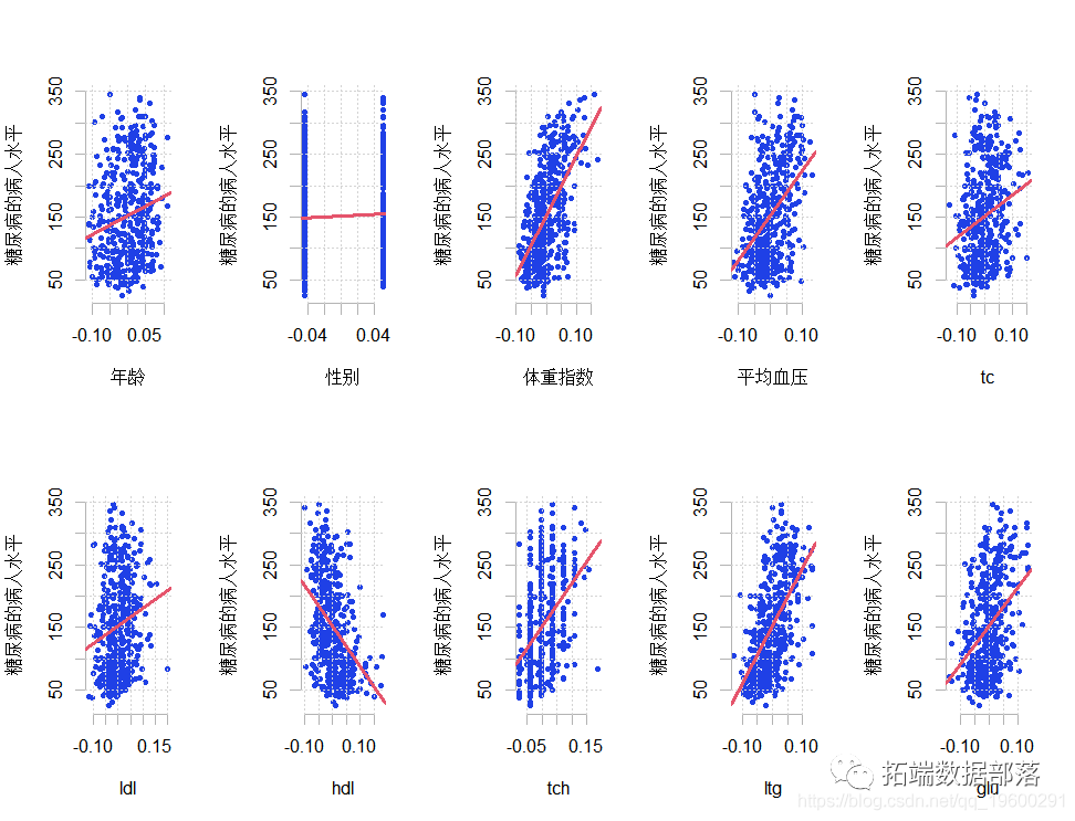 加载糖尿病数据集。这有关于糖尿病的病人水平的数据。数据为n = 442名糖尿病患者中的每个人获得了10个基线变量、年龄、性别、体重指数、平均血压和6个血清测量值,以及感兴趣的反应,即一年后疾病进展的定量测量。"