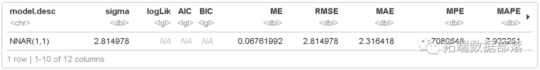 具有单个隐藏层和滞后输入的前馈神经网络,可以用于预测单变量时间序列。将神经网络模型拟合到以时间序列的滞后值作为输入的时间序列。因此它是一个非线性的模型,不可能得出预测区间。