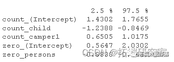 我们可以使用自举获得参数和指数参数的置信区间。对于泊松模型,这些将是事件风险比,对于零通胀模型,优势比。此外,对于最终结果,可能希望增加重复次数以帮助确保结果稳定。