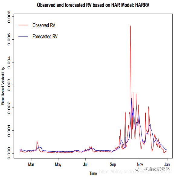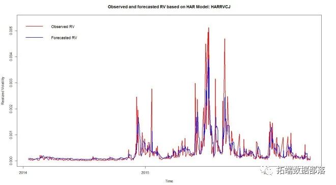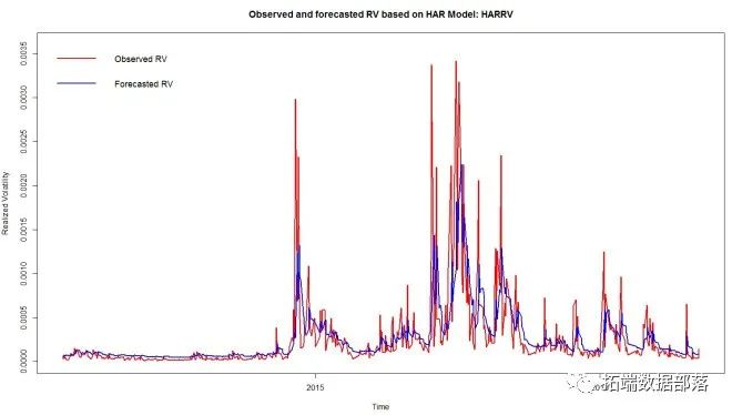 第二步,我们计算传统的异构自回归(HAR)模型。由于HAR模型只是线性模型的一种特殊类型,因此也可以通过以下方式实现:harModel函数的输出是lm的子级harModel lm,线性模型的标准类。图绘制了harModel函数的输出对象,水平轴上有时间,在垂直轴上有观察到的实际波动率和预测的实际波动率(此分析是在样本中进行的,但是模型的估计系数可以显然用于样本外预测)。从图的检查中可以清楚地看出,harModel可以相对快速地拟合波动水平的变化,