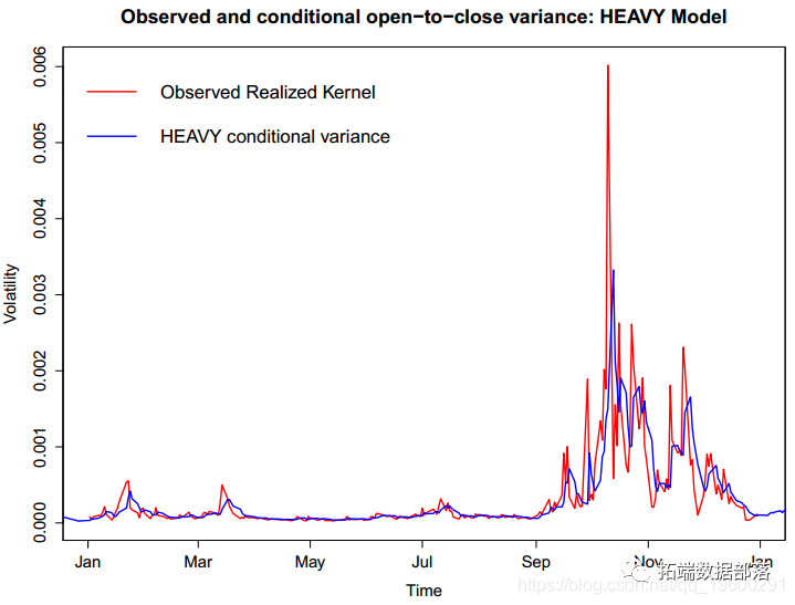 将HEAVY模型拟合到道琼斯工业平均指数。第一步,我们加载道琼斯工业平均指数。然后,我们从该库中选择每日收益和每日实际核估计(Barndorff-Nielsen等,2004)。现在,作为HeavyModel输入的数据矩阵的第一列为收益率,第二列为Realized Kernel估计值。我们进一步将参数设置为采样期内日收益率和平均实际核估计方差。现在,我们来估算HEAVY模型。根据模型的输出,图绘制了由模型中的第二个方程式估算的条件方差。