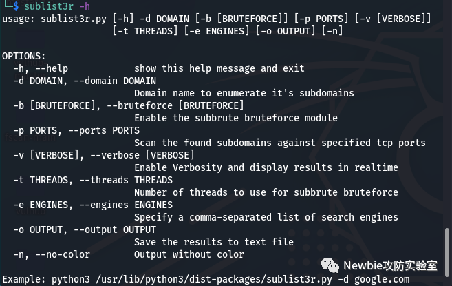 参数详解(kail中-h翻译而来)-d -domain要枚举子域的域名-b -bruteforce启用subbrute bruteforce模块-p -ports根据特定的tcp端口扫描找到的子域-v --verbose启用详细模式并实时显示结果-t -threads用于subbrute bruteforce的线程数-e - 引擎指定逗号分隔的搜索引擎列表-o -output将结果保存到文本文件-h -help显示帮助信息并退出