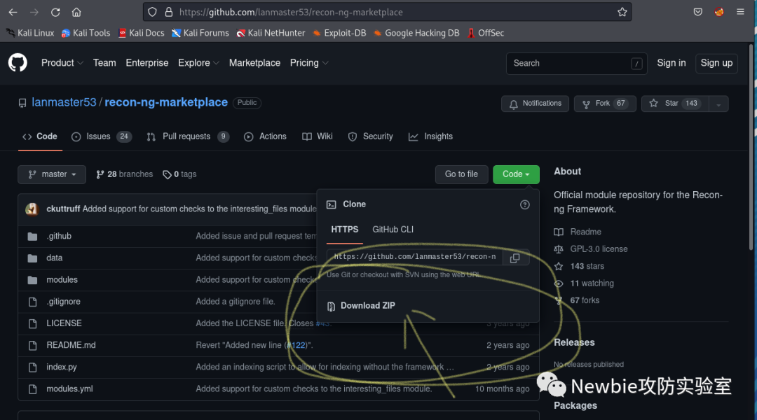 需要安装模块的,否则运行不了,而安装模块一般需要科学上网。但不用科学上网其实也是可以让recon-ng工作的。