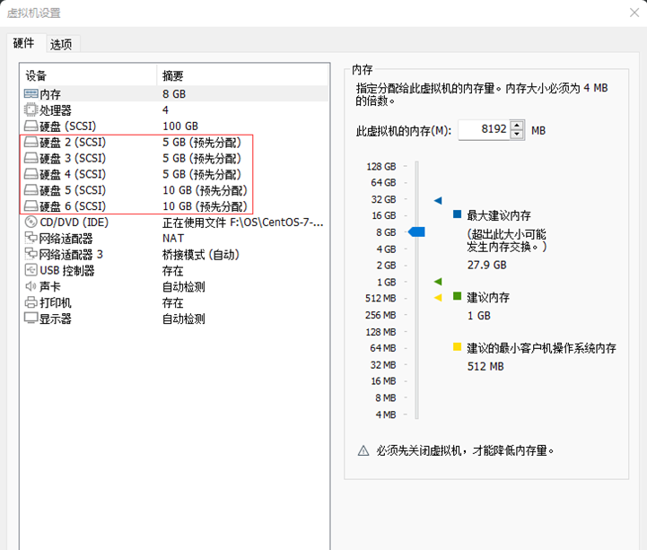 说明:存储服务器端添加3块5g、2块10g磁盘,如下所示: