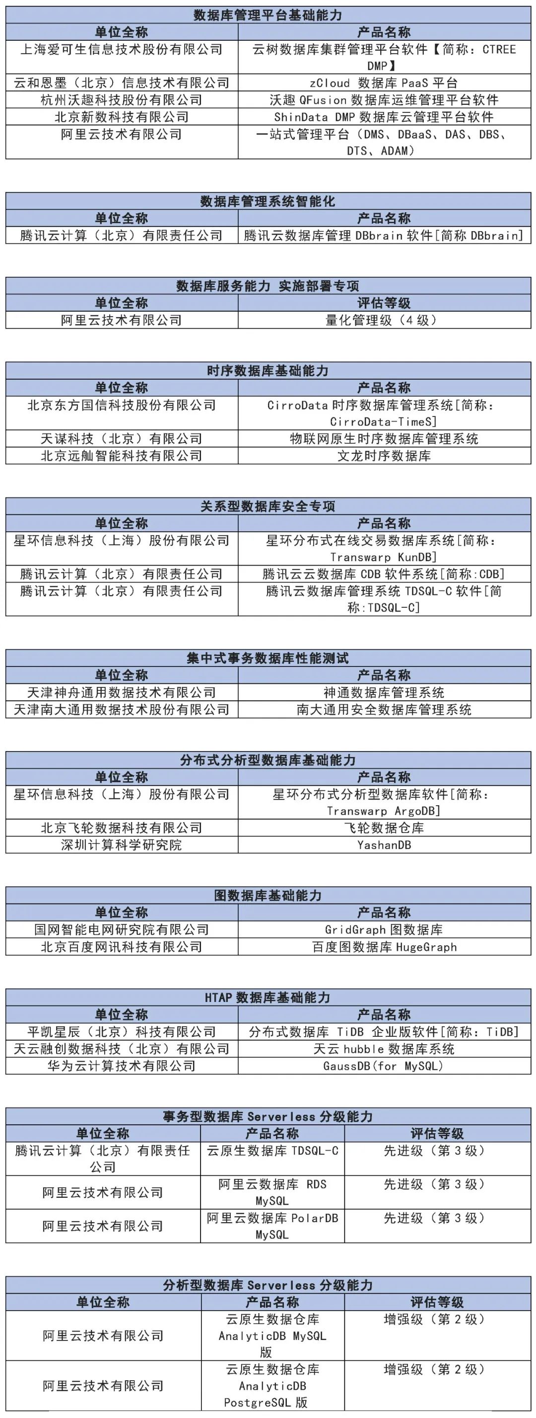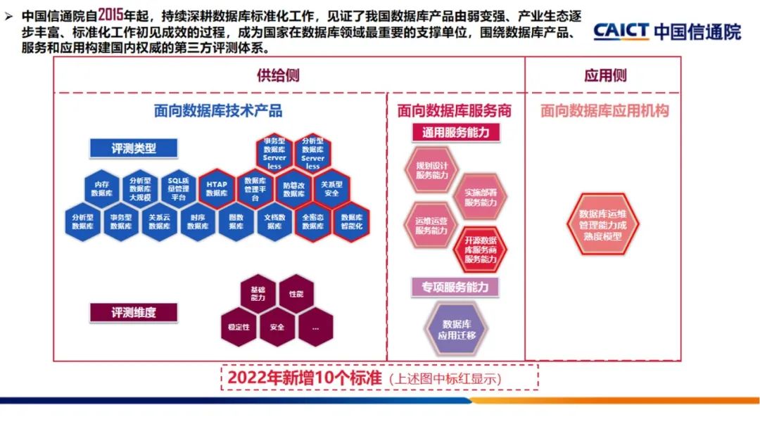 2015年,作为国家高端专业智库、产业创新发展平台,中国信通院逐步开展数据库领域的技术研究、标准编制、评测评估、政策支撑、生态建设等工作。7年来,中国信通院见证了国内数据库顶层设计不断加码,关键技术逐渐突破,产业生态日益繁荣,应用范畴持续扩展,标准化工作有序有力进行,成为国家在数据库领域最重要的支撑单位,已搭建国内最权威的第三方数据库评测评估体系。产品评测体系包括基础能力、性能、稳定性和安全性等;服务评估体系包括通用服务能力和专项服务能力评估。截止2022年12月底,已开展15批产品能力评测,共计完成70家企业127次基础能力测试、63次性能测试、6次稳定性和3次安全能力测试。