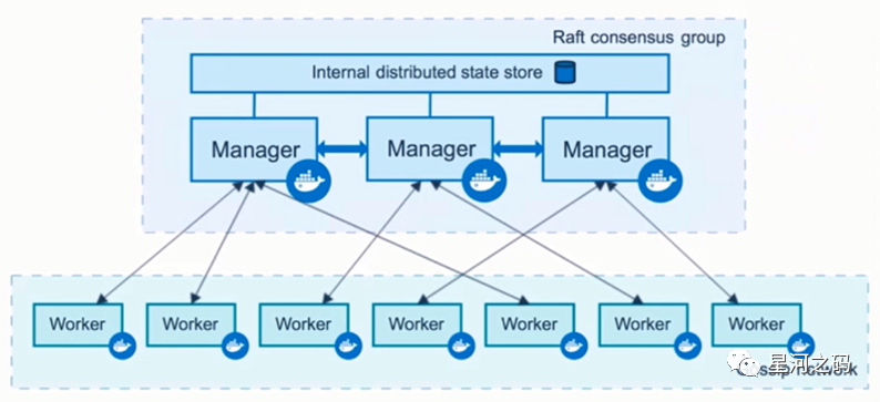 manager节点状态、信息的同步根据Raft consensus group(Raft一致性算法)的网络进行通信同步的,而worker之间的通信依靠的是Gossip network通信协议实现的。