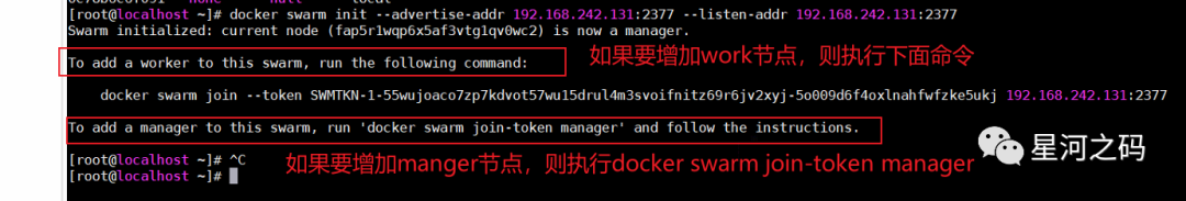 docker swarm init --advertise-addr 192.168.242.131:2377 --listen-addr 192.168.242.131:2377执行上面命令后,就会初始化swarm集群,并且会告诉我们如何增加wrok 节点和manager节点