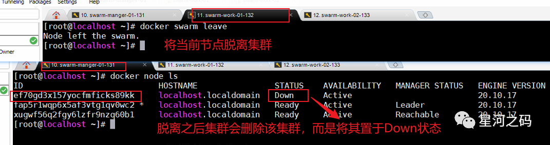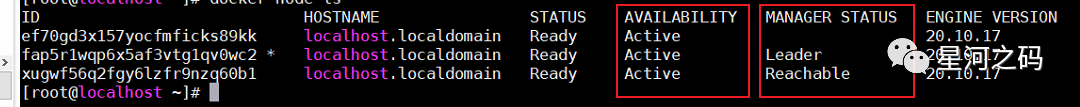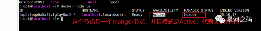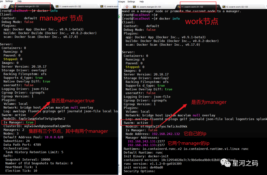 可以分别在manager和node中查看节点的swarm信息,对比差异