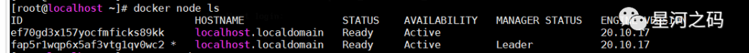 Node是加入到Swarm集群中的Docker实例,即是一个docker节点,包含上面说的【管理节点(manager)和工作节点(work node)】