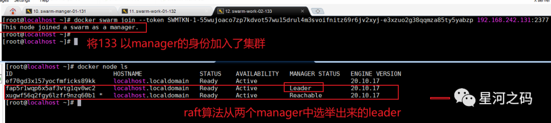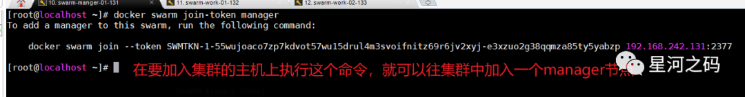 一个集群要有多个manager节点,上面加入了work节点,接下来在集群中加入一个manager节点,加入方式一样的,先获取manager的token