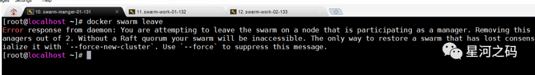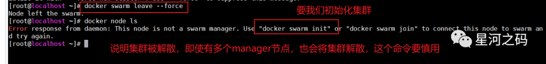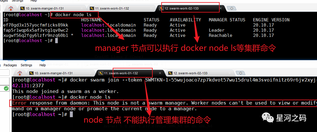「swarm集群中,只有manager节点可以执行swarm命令(比如docker node ls),work节点会报错,因为只有manager节点才可以管理集群,执行集群相关的命令」