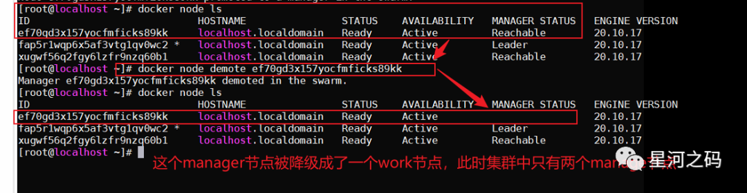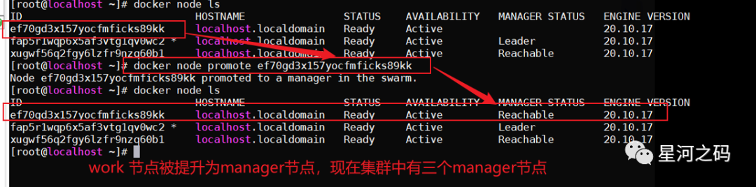 docker node promote通过以上命令可以修改节点模式,将worker节点变为manager节点,也可以将manager节点转换为worker节点。