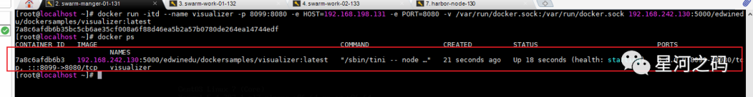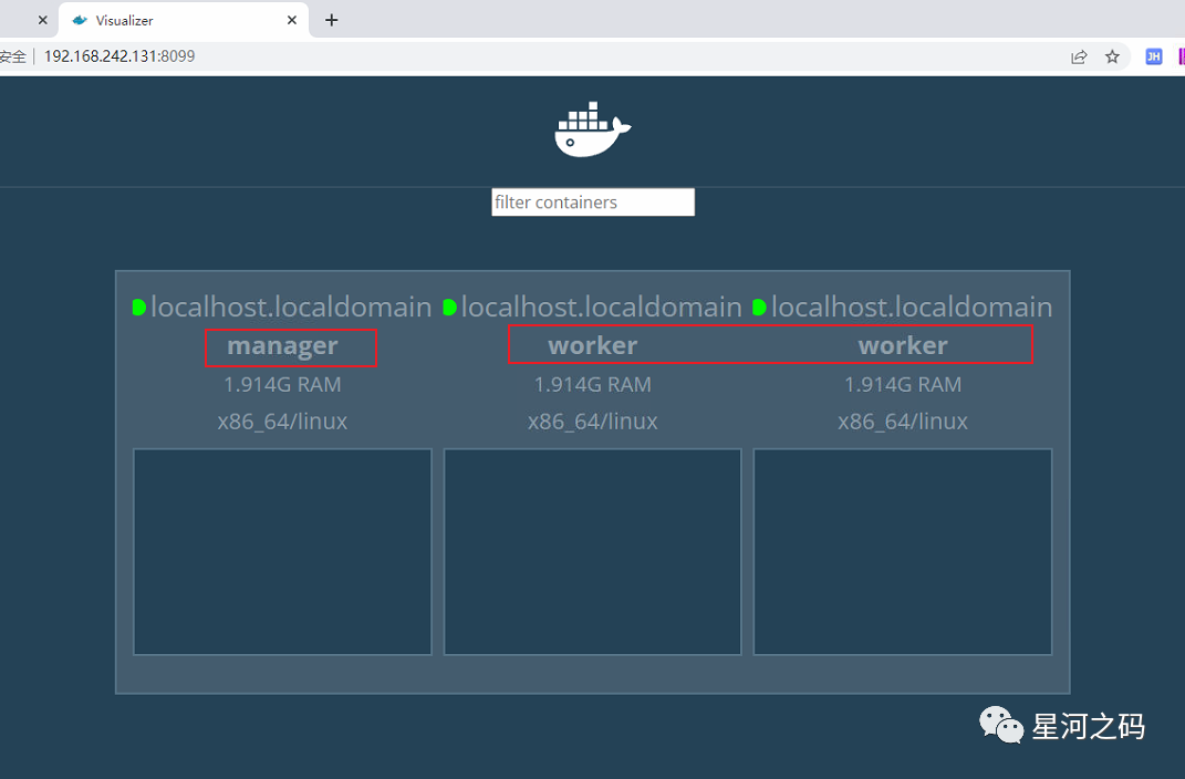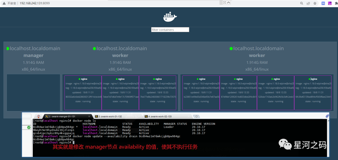 Work节点是容器实际运行的实例节点,在默认情况下manager节点也是work节点,而且在在Swarm集群中必须存在manager节点