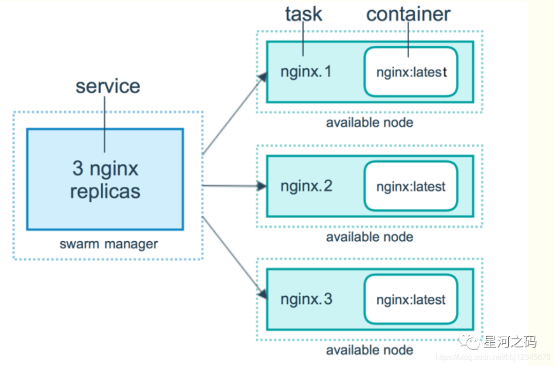 如上service中有三个replicas tasks,每个实例是Swarm集群中的一个task。