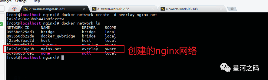 # 创建nginx网络 networks中也可以不指定driver:overlay,因为docker swarm默认网络类型是overlay。