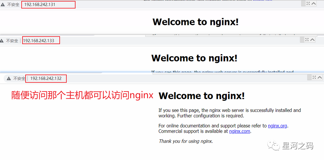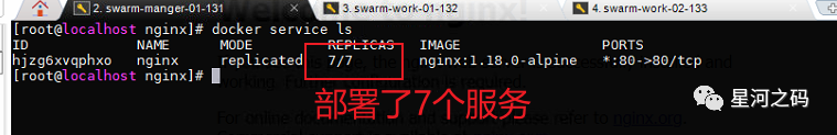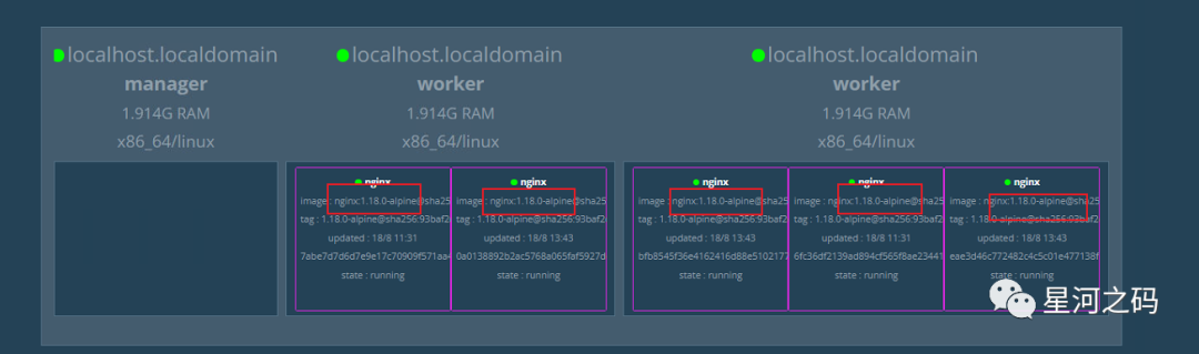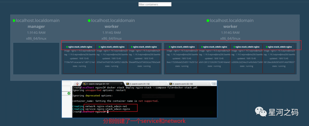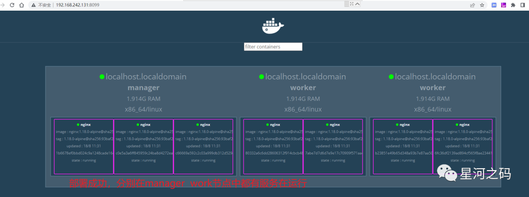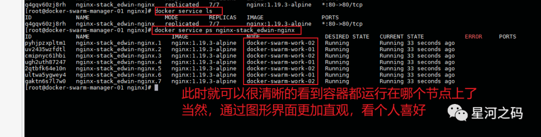 分别按照上述步骤修改主机名字后,再次查看查看7个nginx-stack容器分别运行在哪个节点中,结果如下