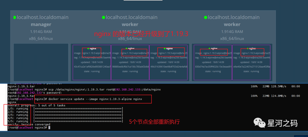 在manager节点执行以下命令,将nginx从1.18.0-alpine升级到1.19.3-alpine