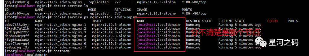 docker service ps nginx-stack_edwin-nginx查看的前提是我们要修改各个主机的名字,不然都会显示localhost.localdomain