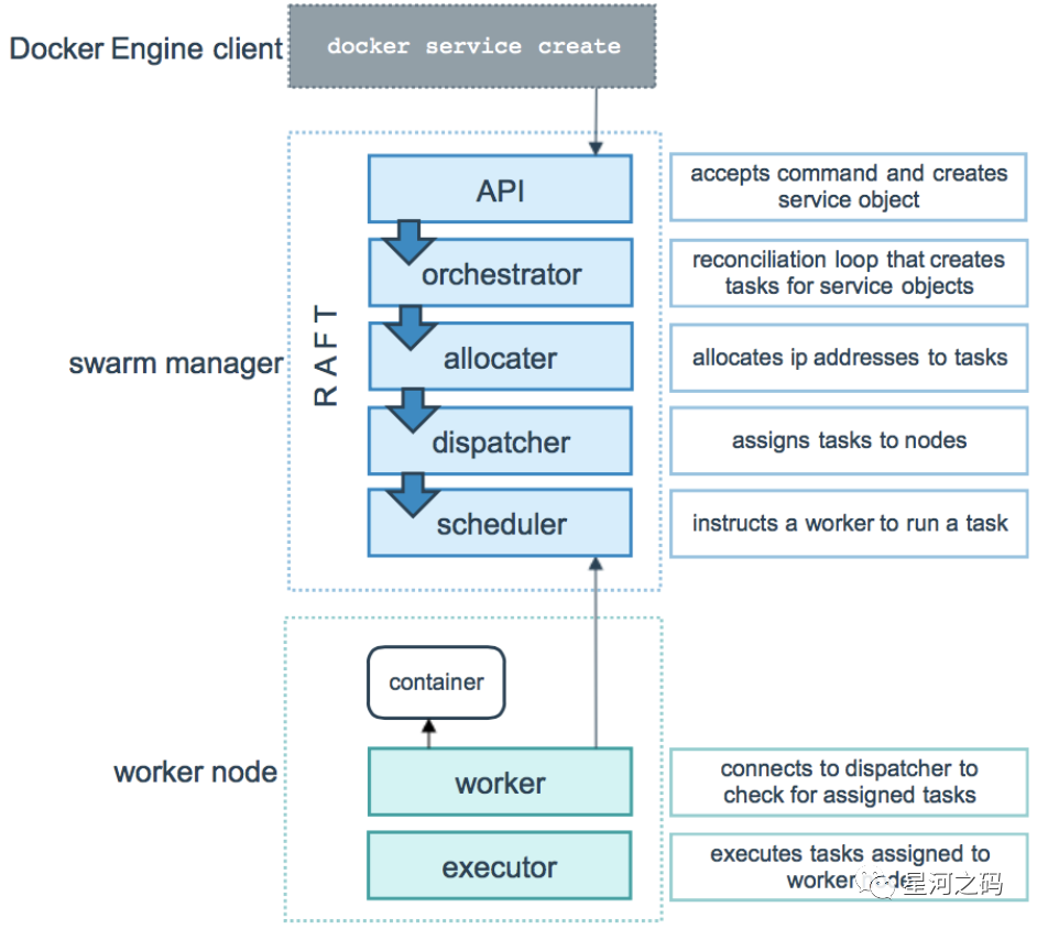「Manager节点的任务分配」 通过 Docker Engine Client 在manage节点使用命令 docker service create 提交 Service 定义 Manager节点根据定义创建相应的 Task,并分配IP地址 将Task分发到对应的节点上 节点进行相应的初始化使得它可以执行Task 「Worker节点的任务执行」 连接Manager节点的分配器检查该Task相关定义的信息 验证通过以后在 Worker 节点上执行Task