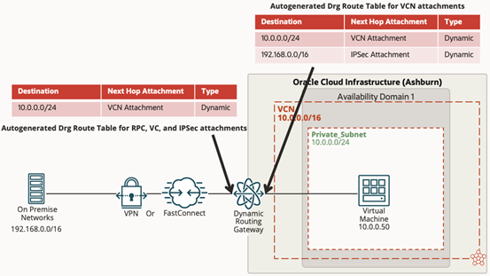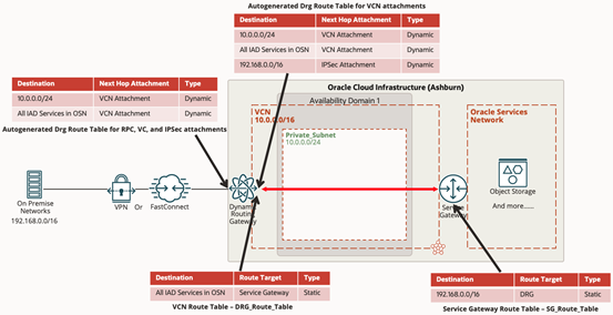 旧版 DRG 包含一个路由表,默认情况下该路由表路由本地网络和它所连接的 VCN 之间所有流量,且无法修改该行为。