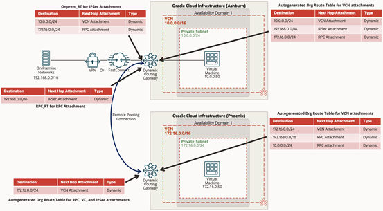 本地网络通过FastConnect 或 IPSec 隧道连接到增强型DRG后,既可以访问该DRG所在Region中的资源,也可以通过该DRG访问其他Region的资源,通过DRG访问其他Region资源需要该DRG和其他Region的DRG建立远程对等连接 (RPC)连接。