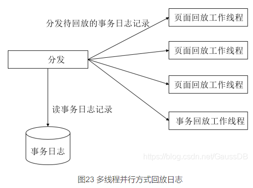 为了能够充分利用 CPU 多核的特点,显著加快数据库异常后恢复及备机实例日志回放的速度,行存储引擎采用了多线程并行方式回放日志,如图23所示。