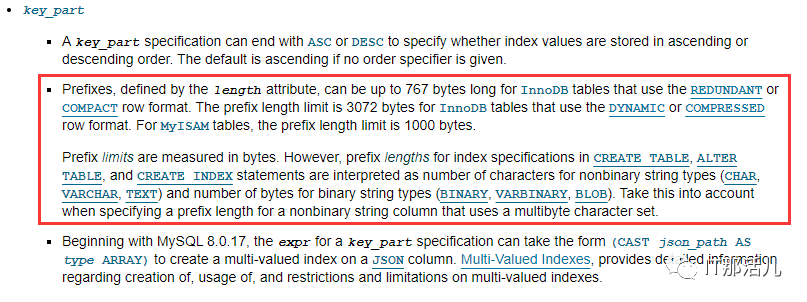上面的意思是说如果启用了索引前缀参数(innodb_large_prefix ),那么InnoDB 存储引擎中的表的行格式为DYNAMIC or COMPRESSED时,prefixes的长度限制长度的最大限制为3072 bytes,关闭了索引前缀参数(innodb_large_prefix )时,prefixes的长度限制长度的最大限制为767 bytes。