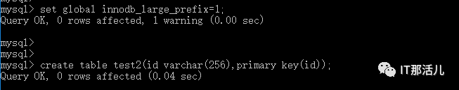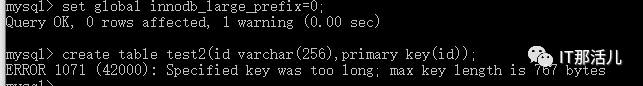 ▼▼▼mysql> set global innodb_large_prefix=1;Query OK, 0 rows affected (0.00 sec)mysql> set global innodb_file_format=BARRACUDA;Query OK, 0 rows affected (0.00 sec)