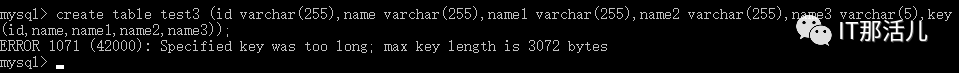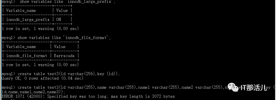 ▼▼▼mysql> ALTER TABLE TEST ROW_FORMAT=DYNAMIC;Query OK, 0 rows affected (0.05 sec)Records: 0 Duplicates: 0 Warnings: 0mysql> create table test3(id varchar(255),name varchar(255),name1 varchar(255),name2 varchar(255),name3 varchar(5),key (id,name,name1,name2,name3)) row_format=dynamic; ERROR 1071 (42000): Specified key was too long; max key length is 3072 bytes