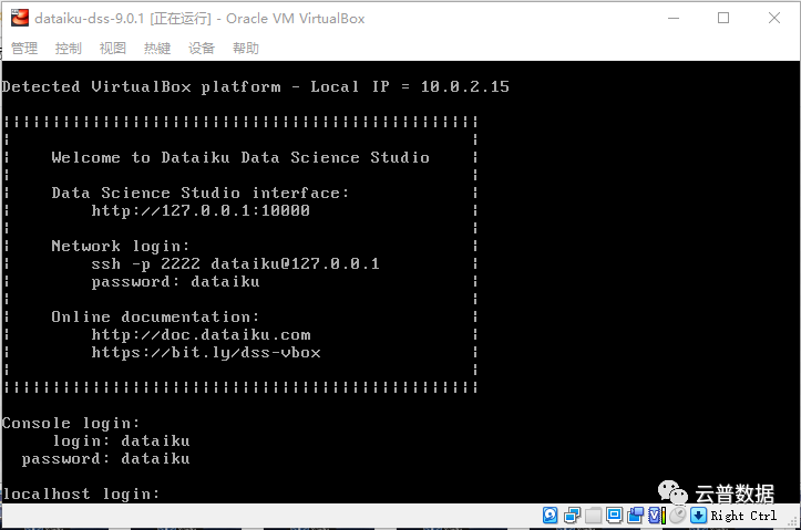 下载和安装Virtualbox.org。Virtual.org网址如下:https://www.virtualbox.org/ 下载DSS镜像。DSS镜像地址:https://cdn.downloads.dataiku.com/public/dss/9.0.1/dataiku-dss-9.0.1.ova 导入DSS镜像到Virtualbox中