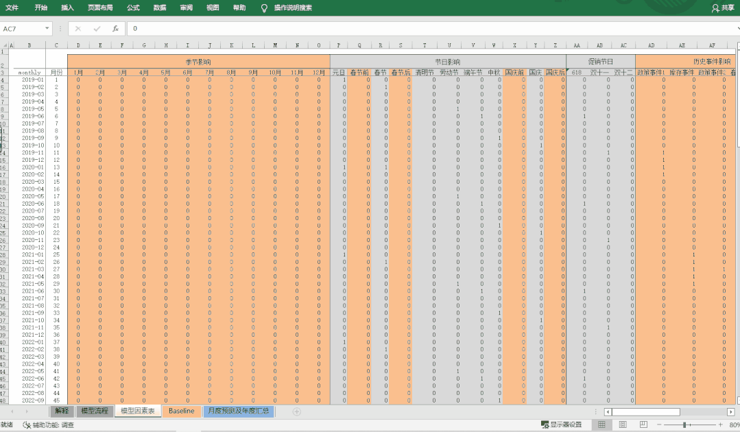 在"模型因素表"表格中,添加影响因素:针对影响因素,只需在对销量有影响的月份标识为1,对销量无影响的月份标识为0即可