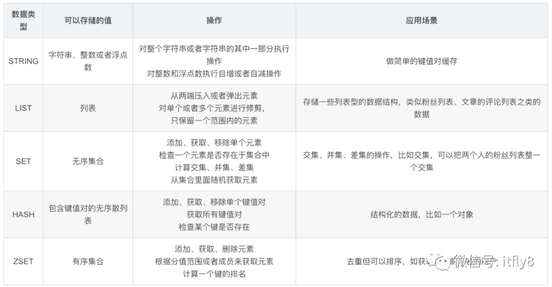 数据类型说明string字符串,最简单的k-v存储hashhash格式,value为field和value,适合ID-Detail这样的场景。list简单的list,顺序列表,支持首位或者末尾插入数据set无序list,查找速度快,适合交集、并集、差集处理sorted set有序的set