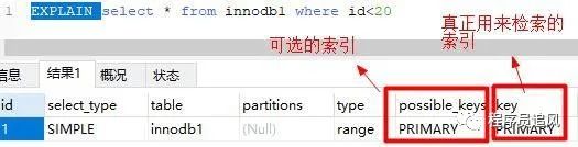 上图中,根据id查询记录,因为id字段仅建立了主键索引,因此此SQL执行可选的索引只有主键索引,如果有多个,最终会选一个较优的作为检索的依据。