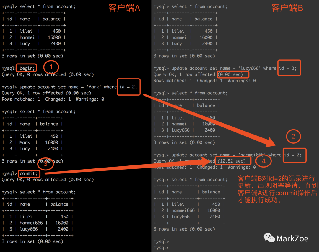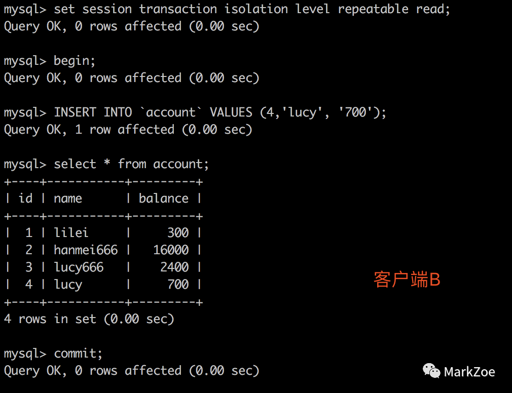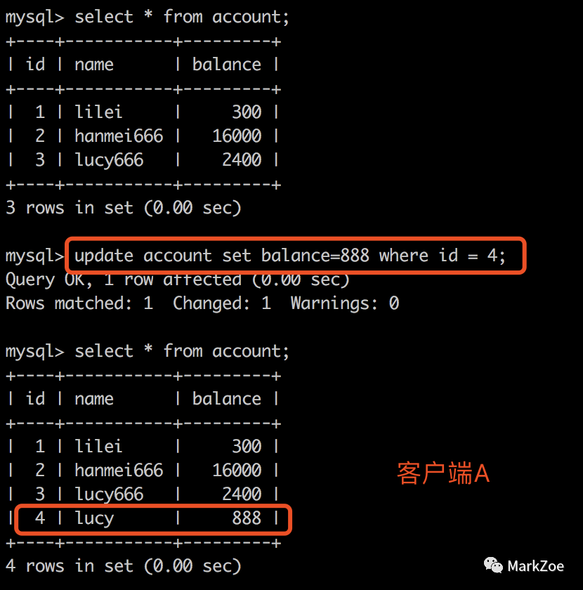 在客户端A执行update account set balance=888 where id = 4;能更新成功,再次查询能查到客户端B新增的数据。