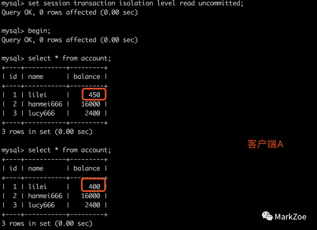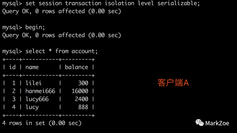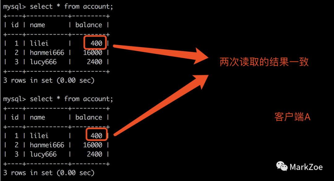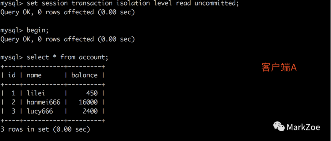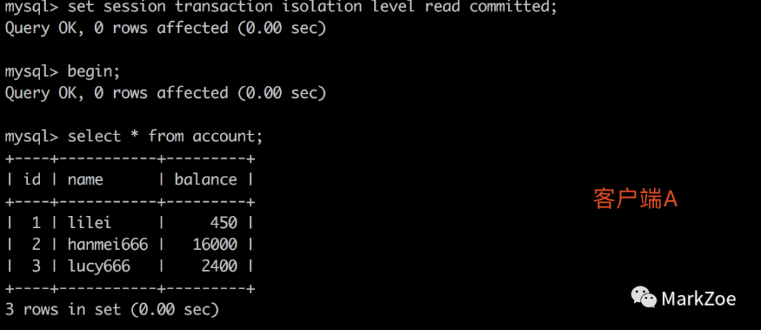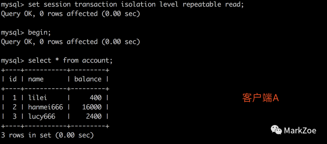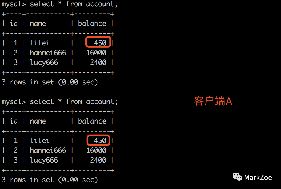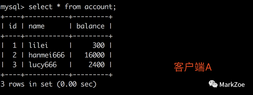 3)在客户端A查询表account的所有记录,与步骤(1)查询结果一致,没