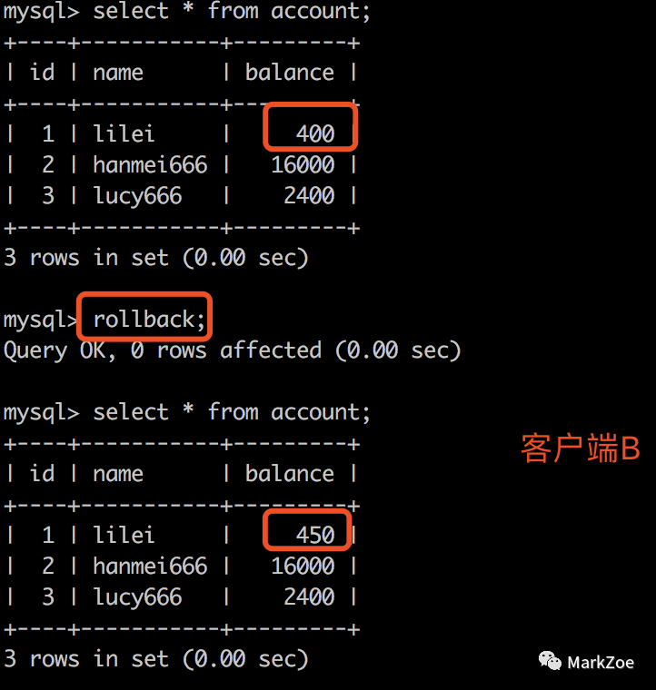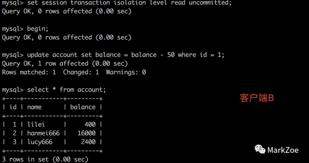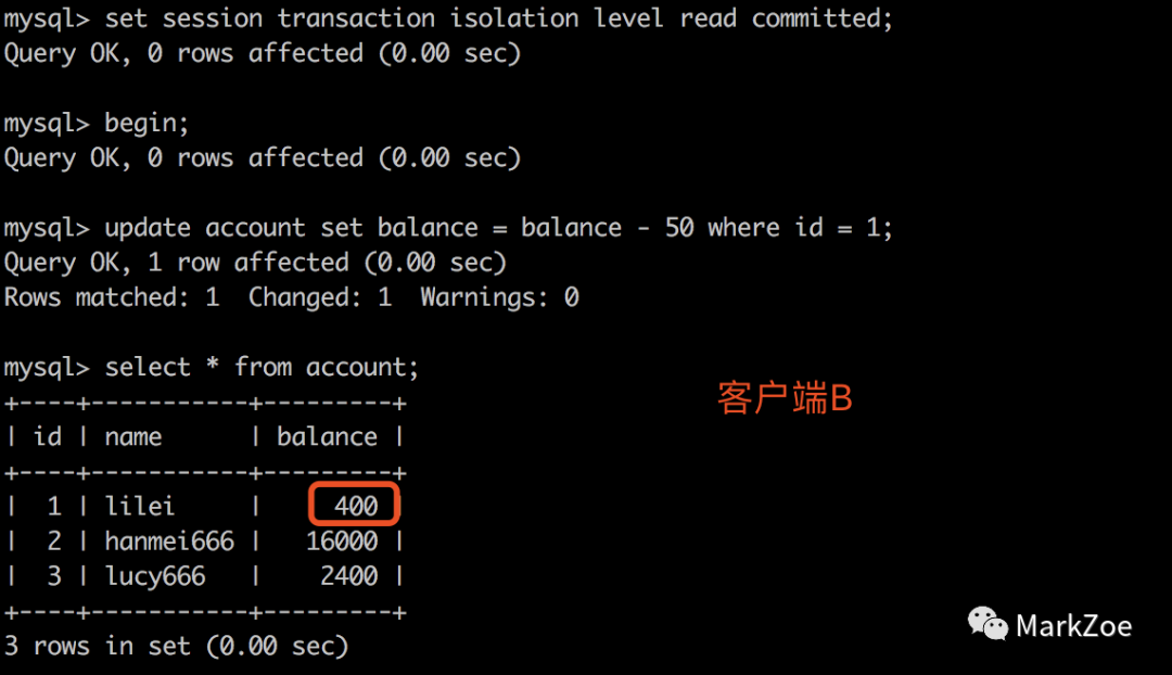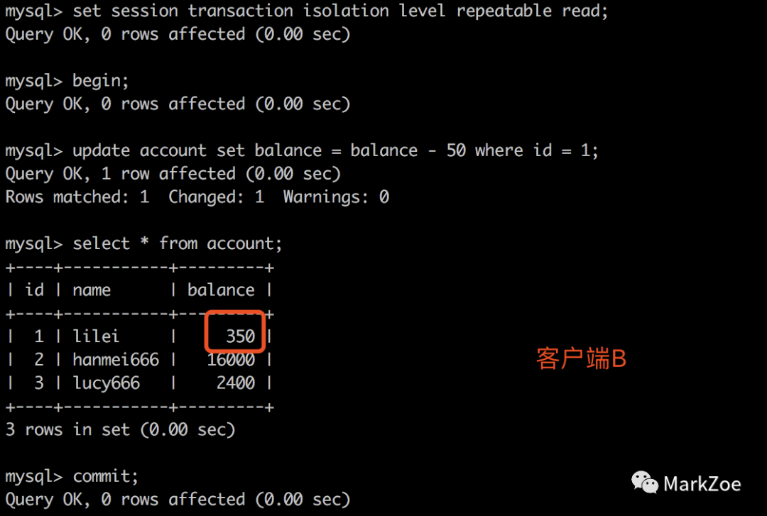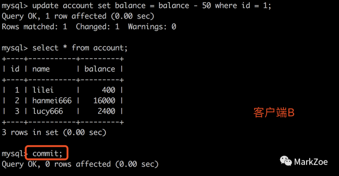 2)在客户端A的事务提交之前,打开另一个客户端B,更新表account并提交