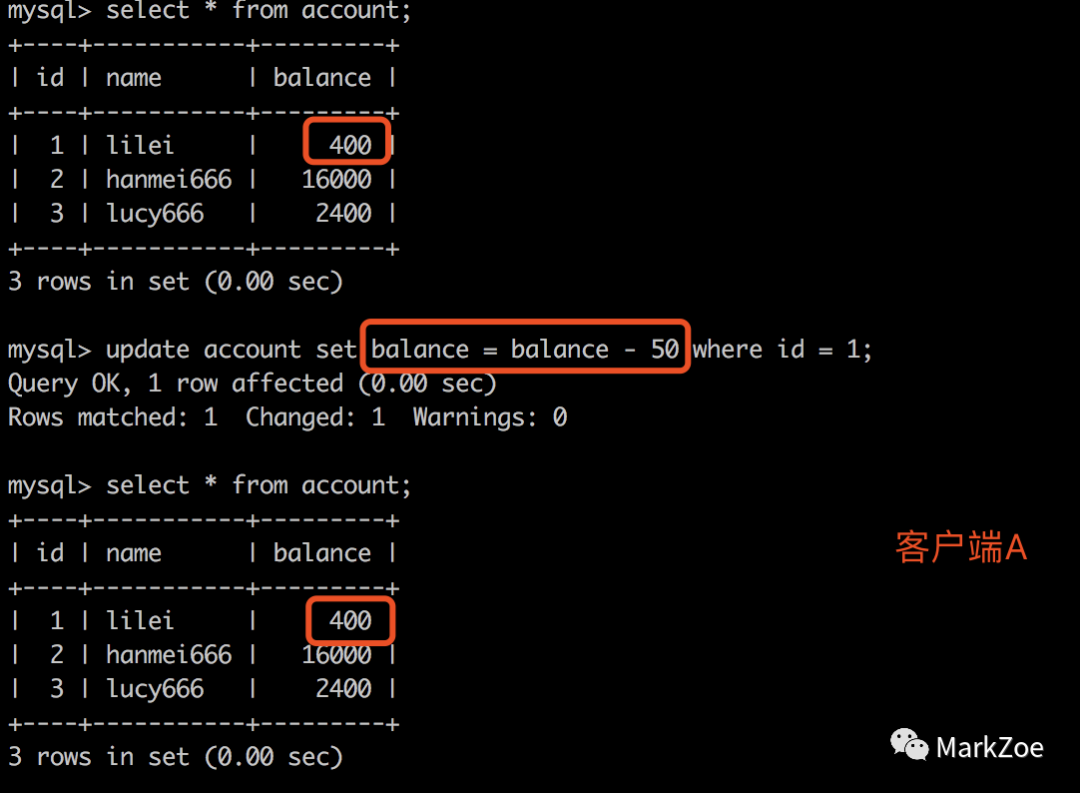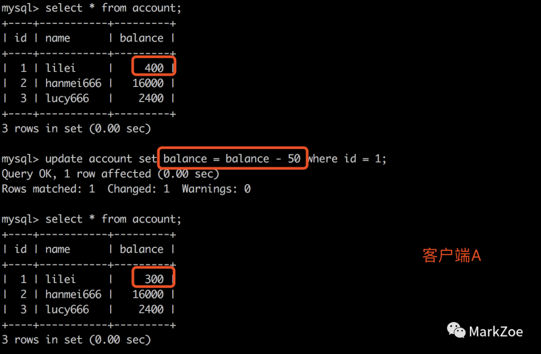 5)在客户端A执行更新语句update account set balance = balance - 50