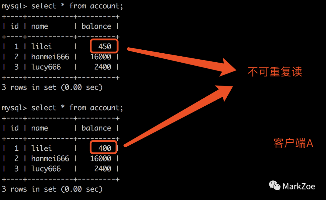 5)客户端A执行与上一步相同的查询,结果 与上一步不一致,即产生了不可重复读的问题