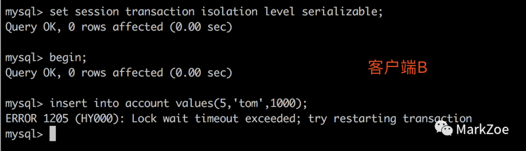 2)打开一个客户端B,并设置当前事务模式为serializable,插入一条记录报错,表被锁了插入失败,mysql中事务隔离级别为serializable时会锁表,因此不会出现幻读的情况,这种隔离级别并发性极低,开发中很少会用到。