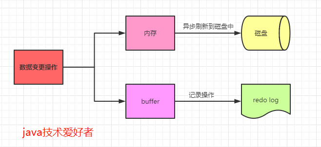 如图所示,当执行数据变更操作时,首先把数据也加载到内存中,然后在内存中进行更新,更新完成后写入到redo log buffer中,然后由redo log buffer在写入到redo log file中。