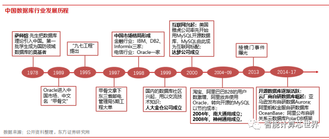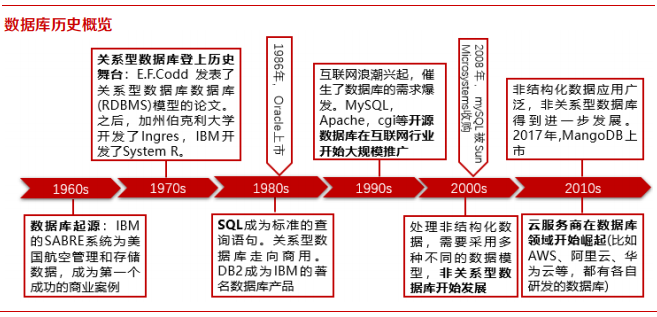 国内的数据库理论最早在 1970 年代引入,在部分领域进行了自研,但在发展早期,市场仍然由Oracle、IBM、DB2、Informix 主导。随着互联网兴起,MySQL 等开源数据库被互联网厂商青睐,互联网行业的飞速发展也带动了国内对于数据库技术和知识的重视程度,人才资源逐渐积累。在 90年代末和 21 世纪初,重要的国产数据库公司成立,并开始进入市场。随着云计算的发展,云厂商针对云的业务场景自研的数据库也登上了历史舞台。整体来看,Oracle、IBM 等海外厂商在国内的市场地位不断削弱,属于国产数据库的行业空间逐步展开。