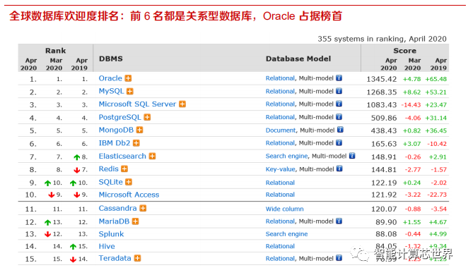 关系型数据库目前仍占据主导地位。据 DB-Engines Ranking 统计,全球受欢迎度前十的数据库名单中,有 8 家是关系型数据库,Oracle、MySQL 和 Microsoft SQL Server 占据前三。