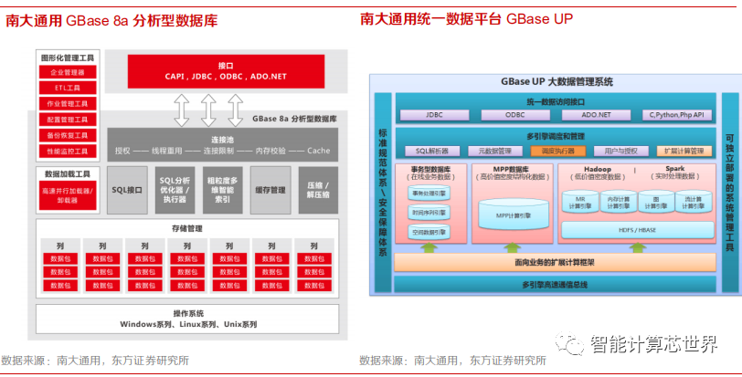 平台型产品:南大通用统一数据平台 GBase UP,融合 GBase 8t、GBase 8a MPP 和 Hadoop 生态的大数据平台产品兼顾大规模分布式并行数据库集群系统、稳定高效的事务数据库,能够适应OLAP、OLTP 和 NOSQL 三种计算模型的业务场景。