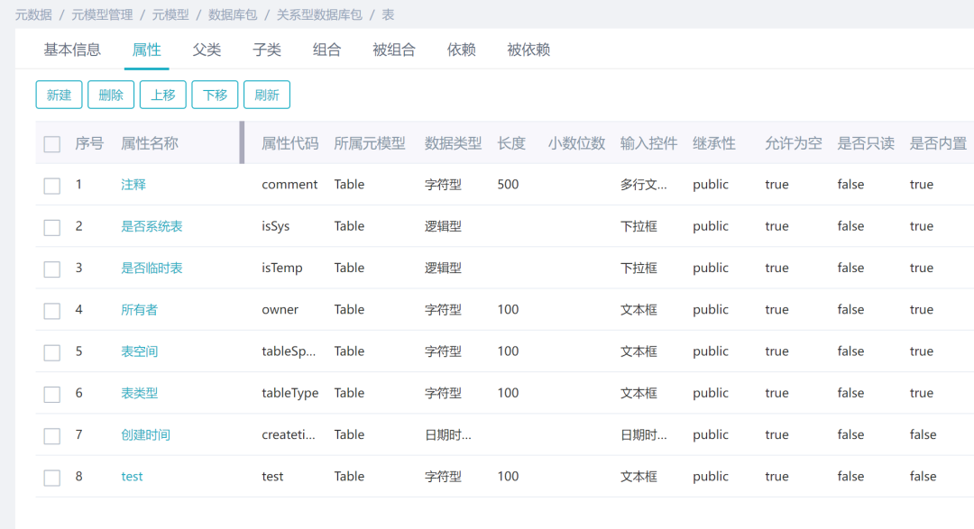 比如,表模型里定义了表的属性有“注释”、“是否系统表”、“是否临时表”、“所有者”等(图1);定义了表由索引、外键、表分区、字段等组成(图2);定义了表受表输出组件、存储过程、表等的影响(图3)。