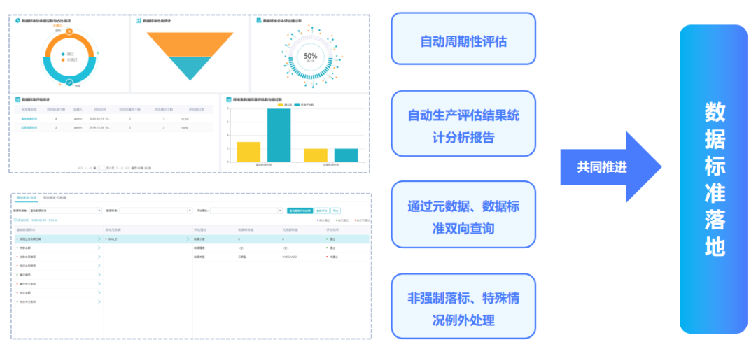 数据标准的设计目的是为了规范各业务系统的数据建设。睿治数据治理平台支持对数据标准设置落地映射,一条标准可根据实际业务需求进行多个映射,映射设置细化到实际业务系统对应的元数据上,为后续的落地评估提供依据,设置好的落地映射支持修改、删除。为了方便用户检查业务系统是否按照数据标准进行建设,睿治数据治理平台提供对数据标准进行落地评估,并支持多种方式评估,包括单条数据标准、标准集进行评估。同时支持通过数据标准和元数据双向评估标准落地情况,并且支持设置非强制性落标,设置了非强制性落标的元数据进行落标时可以例外通过,除界面手动操作评估外,睿治数据治理平台让用户通过配置定时计划任务,进行自动化评估。(4)数据质量管理
