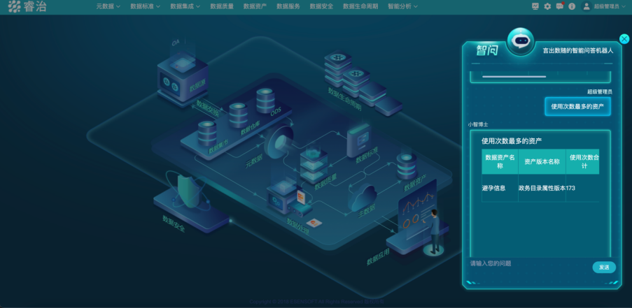 睿治数据治理平台利用最新的自然语言处理(NLP)、机器学习、知识图谱等人工智能技术,用语音/文字输入一句话,就能获取最贴切的数据分析图表。智能出图,无需做表,零门槛使用,快速的展现数据治理的成果。