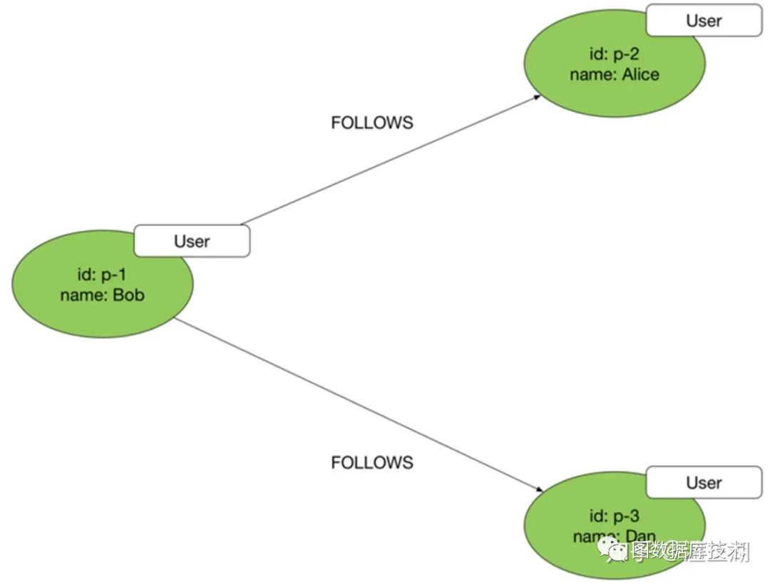 在上图中,绿色椭圆代表点,3个点的标签均为User;带箭头的直线表示有向边,箭头所指为边的终点,另一端为起点。边的类型为FOLLOWS。每个点都有2个属性,分别是id和name,类型均为String。