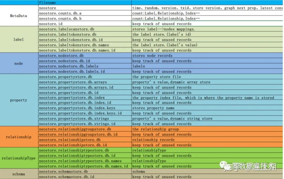 但本文聚焦的neo4j,却不是这么做的,他们称之为“原生图存储”(native graph storage)。下面就来重点分析下,所谓的原生图存储是怎么样的。首先贴一张neo4j数据目录下的文件列表: