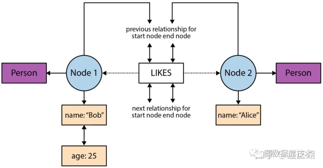 图中包括2个标签为Person的点:Node 1和Node 2,Node 1有2个属性,分别为name:bob,age:25;Node 2有1个属性name:Alice。bob喜欢Alice,通过LIKES这条边来表示。由于2个点仅存一条边,所以LIKES边的起点和终点的下一条边指针为空。